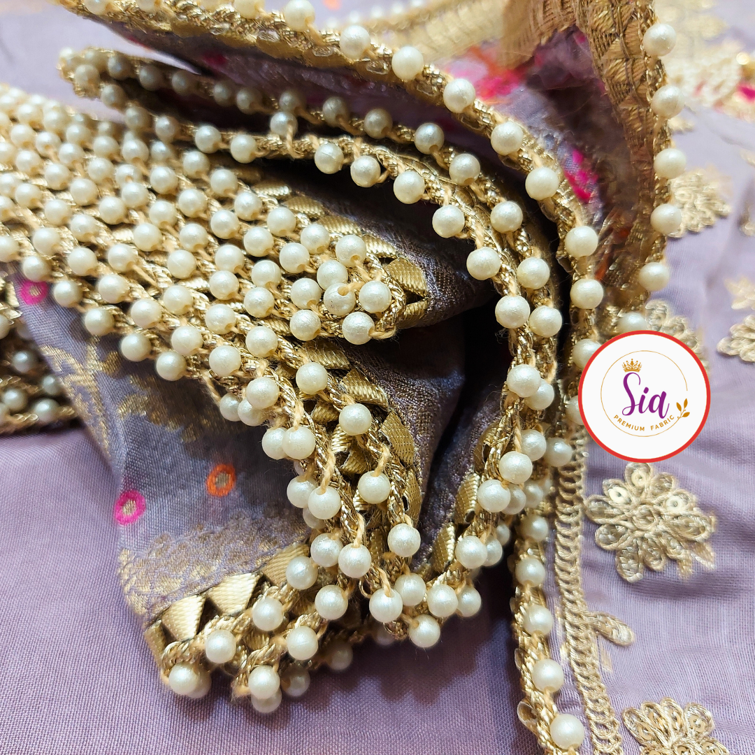 The matching dupatta features coordinated pearl embellishments, enhancing the overall finesse of the ensemble while maintaining its soft, graceful appeal.