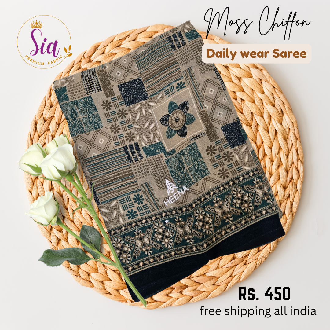 A very soft, airy fabric in calming neutral tones—cream as the base, accented with crème, magenta, green, and maroon. Effortless elegance in every drape.