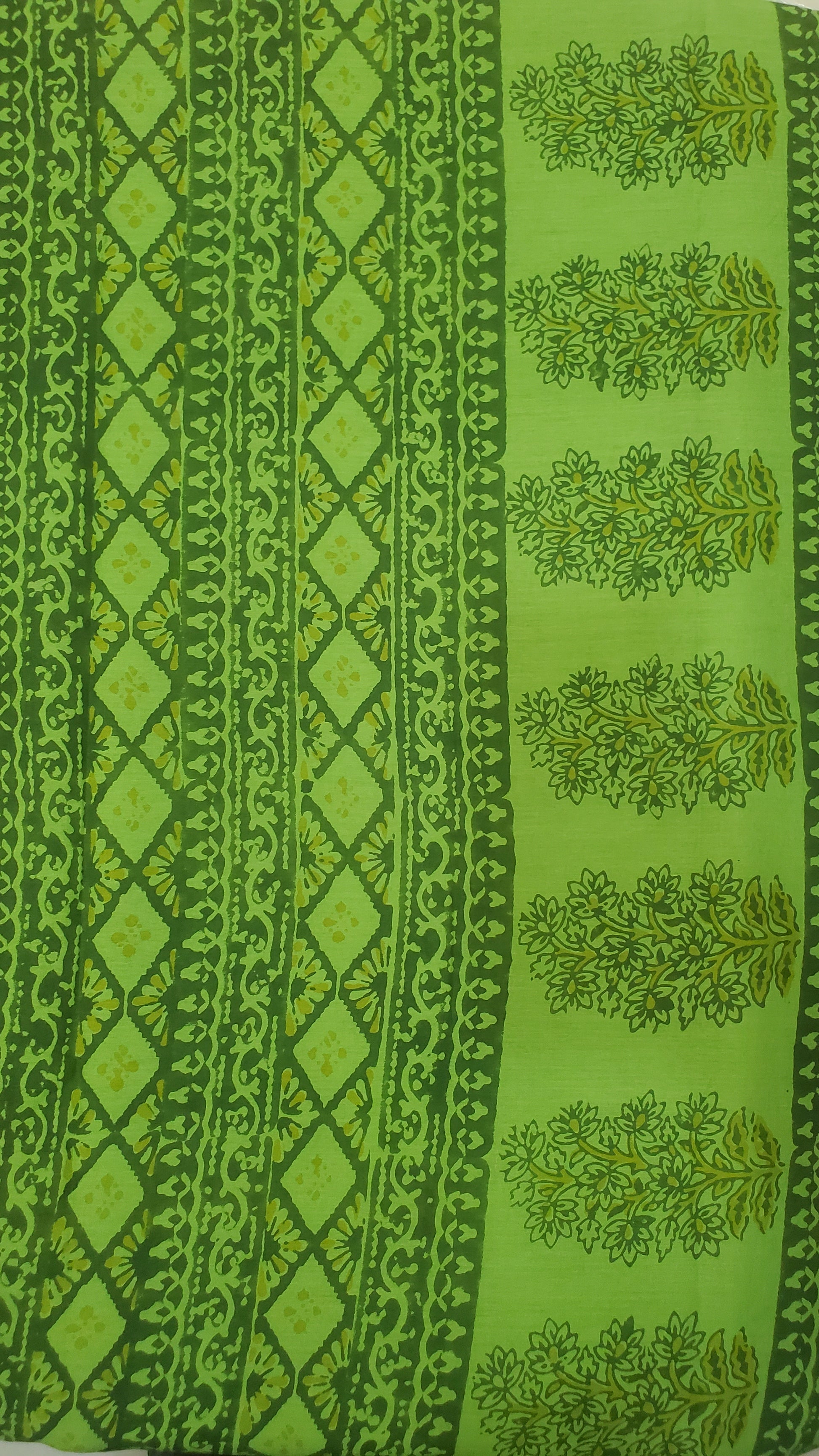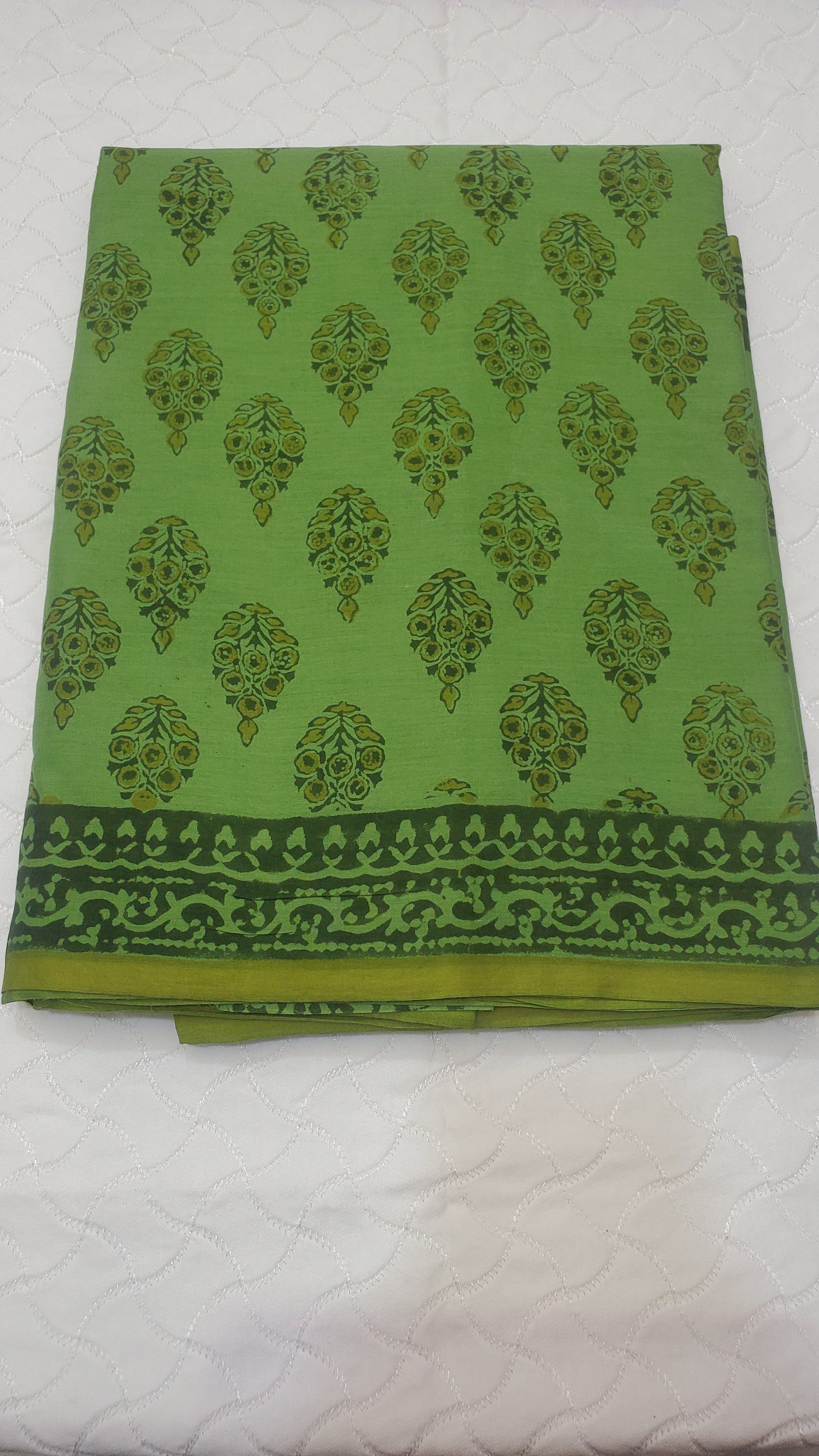 A graceful blend of tradition and craftsmanship β this lush green saree with intricate floral motifs and a complementary blouse piece (placed on top in the image) is handcrafted using natural vegetable dyes by artisans from Ahmedabad, Gujarat.