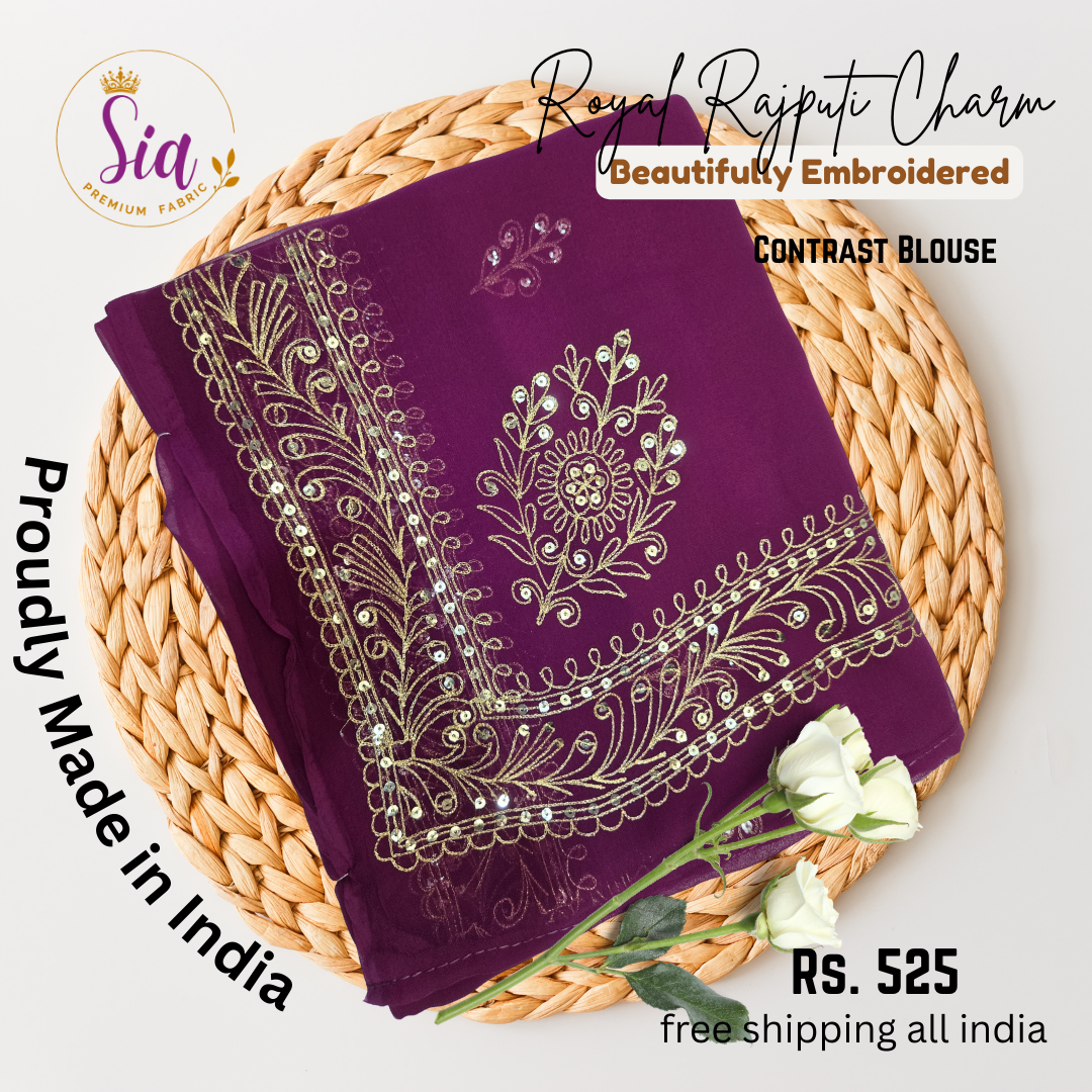 Experience the true essence of Rajputana heritage on premium georgette material, adorned with stunning embroidery and paired with contrast blouse colours for a bold, elegant look.