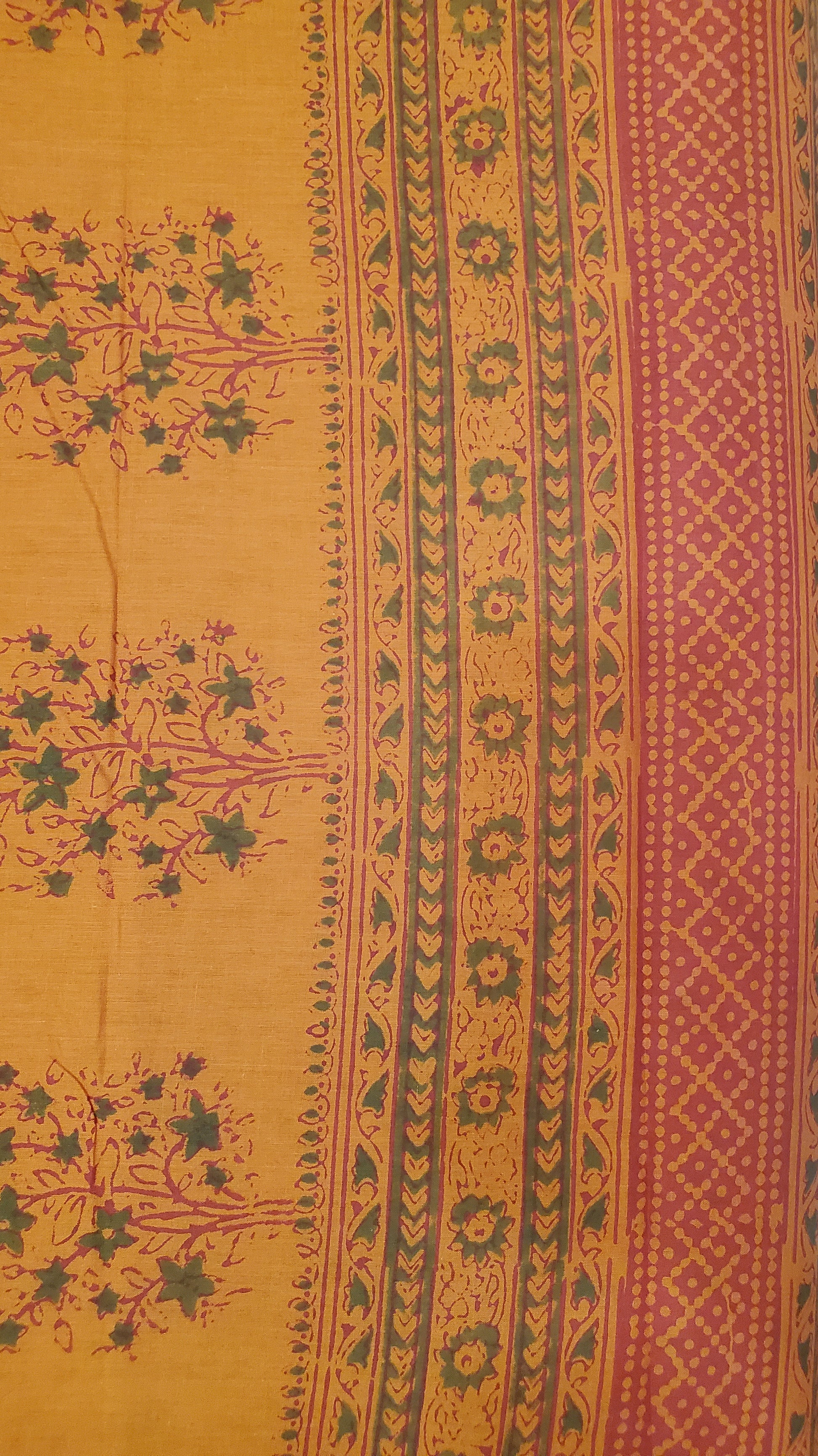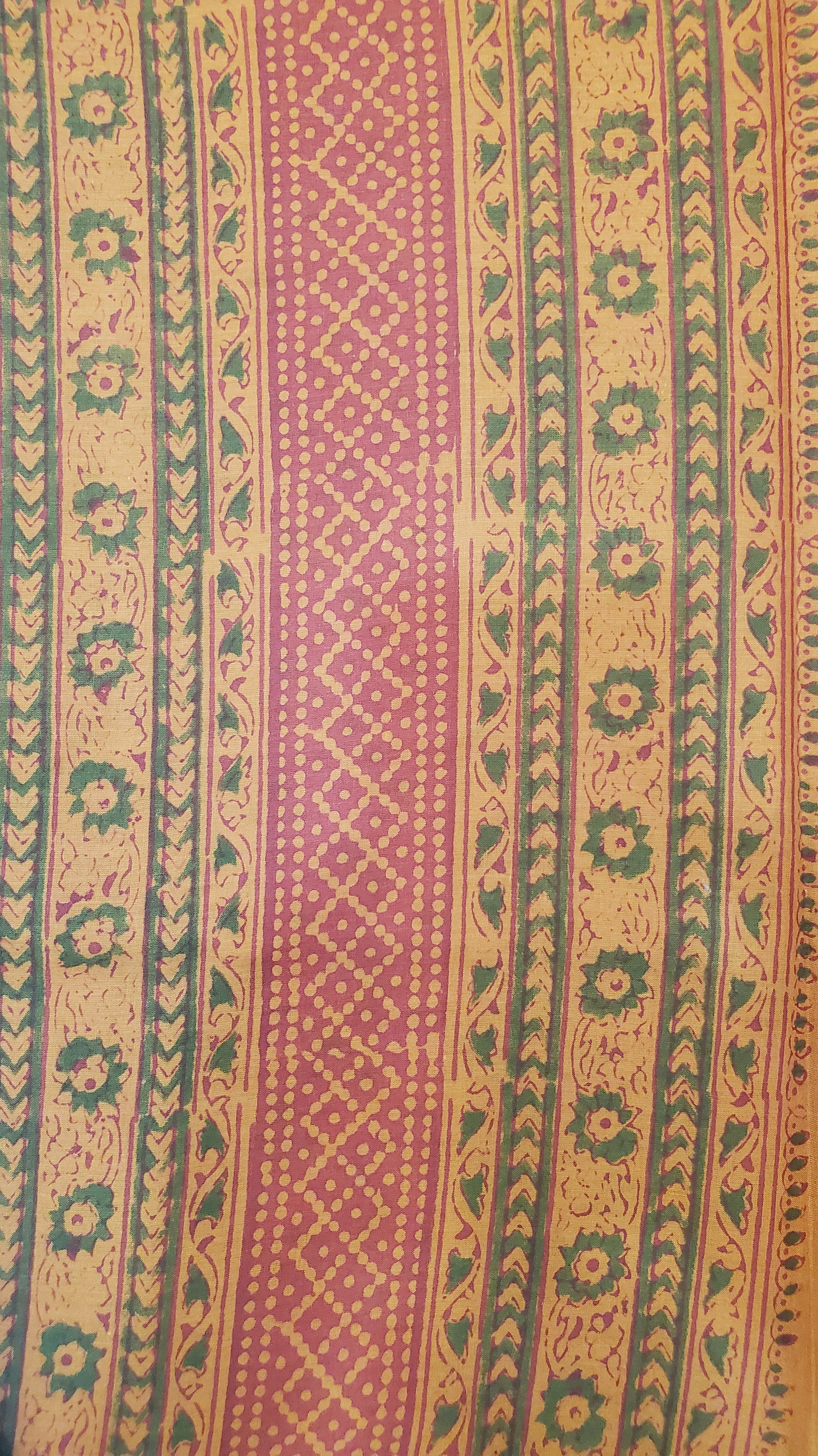 A radiant blend of earthy tones and timeless tradition — this burnt orange beauty features classic hand block floral motifs and intricate borders, handcrafted with natural vegetable dyes by our skilled artisans from Ahmedabad, Gujarat.