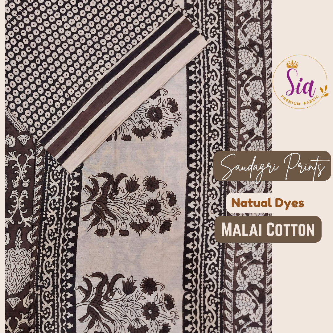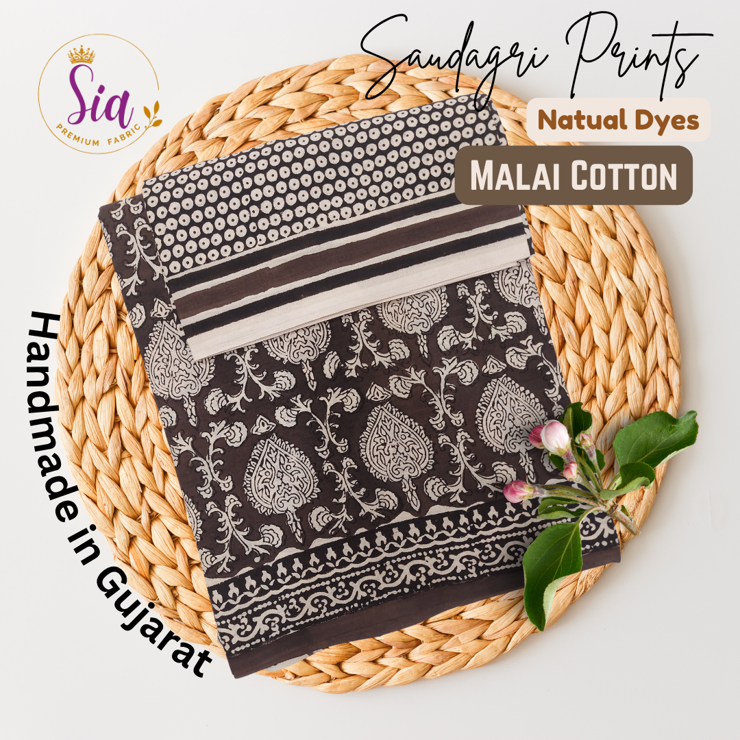 A timeless tradition revived โ€” this soft, breathable Malai Cotton fabric features Saudagri block prints, a centuries-old art form from Gujarat. Handcrafted using natural dyes, each piece carries the soulful touch of skilled artisans, who painstakingly create delicate, detailed motifs that are challenging to achieve.